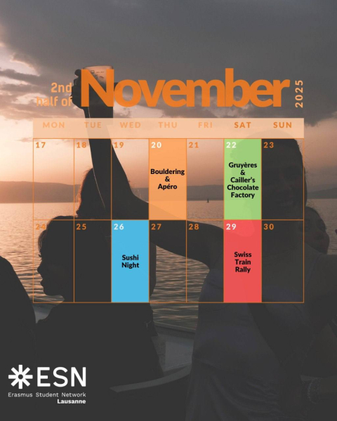 ESN EPFL is a student association whose purpose is to help international and exchange students in Lausanne make the best of their stay in Switzerland. To achieve this, we organize a wide range of events, from city tours to sport weekends, thematic parties, international dinners, and trips throughout the country. To answer the desire for integration and cultural understanding of students, we also set up a Buddy Matching system each semester, and are always willing to collaborate with other associations from EPFL and UNIL.